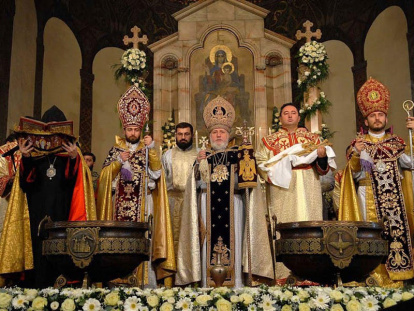 El Patriarca armenio y sus obispos en una celebración de la Epifanía; el 6 de enero del calendario juliano se ha convertido en nuestro 18 de enero del calendario gregoriano; la Epifanía armenia es fiesta de bautismo y luz, más que de nacimiento de Jesús