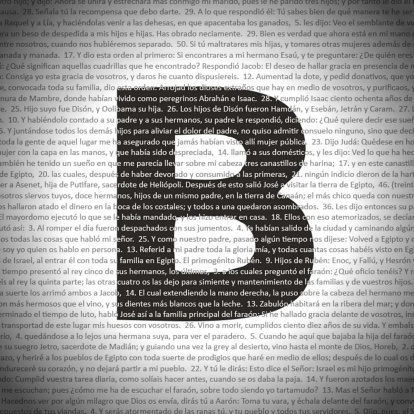 Según explican desde este estudio de diseño gráfico con experiencia en comprimir libros, tanto el Antiguo como el Nuevo Testamento van en texto corrido, (eliminando saltos de página, puntos y aparte, etc) y sobre él se superpone en color negro el texto: LA BIBLIA_ANTIGUO TESTAMENTO/NUEVO TESTAMENTO.
