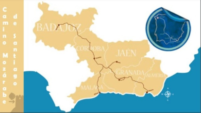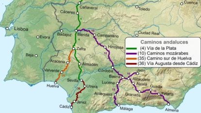 Las tres salidas del Camino Mozárabe (Málaga, Almería y Jaén), que se encuentran en Mérida con los otros caminos andaluces hacia Santiago.