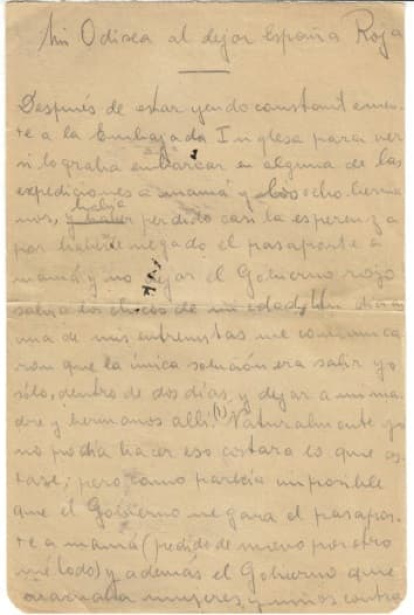 Una de las hojas del testimonio (manuscrito en catorce cuartillas) de su salida del Madrid republicano, poco después de que asesinaran a su padre