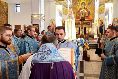 Imagen peregrina de la Virgen de Fátima en una parroquia grecocatólica en Leópolis, Ucrania... la consagración de Rusia y Ucrania alude a varias tradiciones