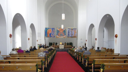 Interior de la iglesia del Rosario en Hetzendorf (Viena). La rica decoración interior fue devastada en 1958 por una reforma impulsada desde la curia diocesana que provocó un gran debate público y una gran oposición y decepción de los fieles. Foto: Thomas Schuster (CC BY-SA 3.0).