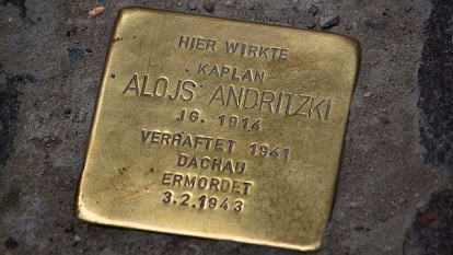 La 'Stolperstein' de Alojs Andritzki [Piedras de la memoria; literalmente, 'piedras de tropiezo': un proyecto del artista Gunter Demnig para recordar a víctimas del nazismo], situada delante de la catedral de Dresde. Indica su muerte en el campo de Dachau. Foto: Julian Nyca / Wikipedia.