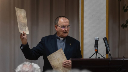 José Luis Rubio Willen, responsable de la Comisión de beatificación de la reina Isabel, obsequia al presidente del Club de Opinión Santiago Alba, Felipe Martínez-Sagarra Alba, con uno de los testamentos de la reina que confecciona la propia institución.
