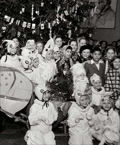 Unos niños contemplan un abeto navideño... algo prohibido durante años en la URSS, y aceptado luego si se adornaba con signos comunistas