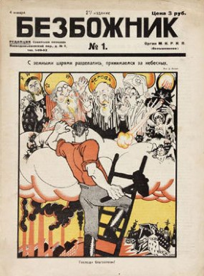La más famosa era el "Juicio contra Dios", de Rezbushkin: un pope de pueblo, un imán tártaro y un rabino judío, cada uno con su gracioso acento local, dejaban bien claro que sus creencias eran ridículas y bobas. Esta obra de teatro se exhibía en calles, delante de iglesias. También en locales del Partido Comunista, municipales o de la Unión de los Sin Dios, la gran asociación atea militante al servicio del Partido.
