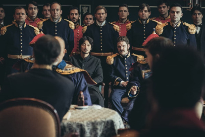 En un fotograma vemos trajes coreanos, con sus extraños sombreros; en otro, chinos; en otro, europeos, con uniformes azules franceses o rojos británicos. Y el negro de los sacerdotes. Lo específico de esta película es su asombrosa combinación, su convivencia de varios mundos visuales, arquitectónicos, incluso gestuales.