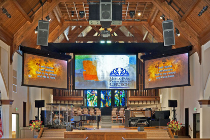 Es difícil ver una cruz en esta iglesia presbiteriana de Menlo Park, pero las pantallas lo ocupan todo