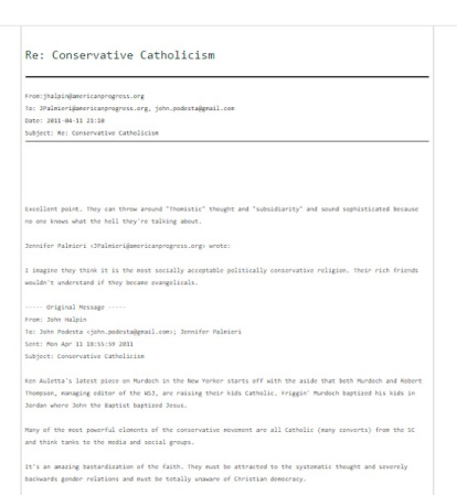 Por un lado, afirma que "los católicos retrógrados que creemos en lo que enseñan las Sagradas Escrituras y la Iglesia estaríamos muy agradecidos" si el equipo de campaña de Hillary repudiase el contenido de esos mensajes.