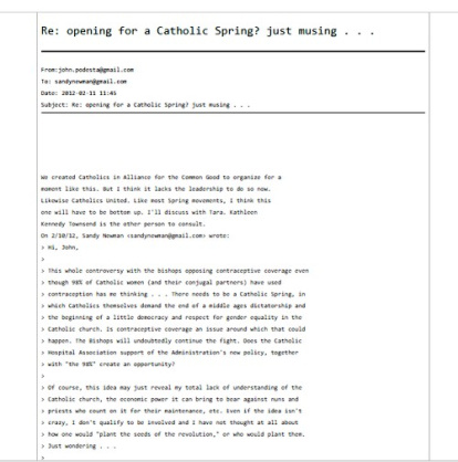 Otra conversación relevante tiene lugar el 11 de febrero de 2012 entre John Podesta y Sandy Newman, fundadora en 2009 de otro lobby progresista, Voices for Progress, bajo el asunto: ¿Abiertos a una primavera católica? Pensando en voz alta...