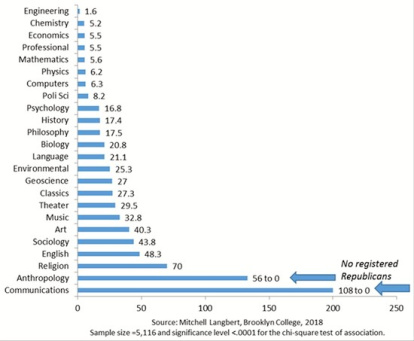 Por áreas de conocimiento, el resultado es aún más significativo. En Comunicaciones [Periodismo] (108 a 0) y Antropología (56 a 0), sencillamente no hay republicanos. Y la siguiente materia en cuanto a desproporción es la Religión: 70 profesores demócratas por cada profesor republicano, la tercera mayor proporción.