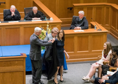 Los padres de Amy Coney (él es abogado y diácono permanente) ponen la toga de juez a su hija; ella se crió con seis hermanos y tiene 7 hijos, dos adoptados en Haití