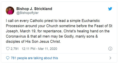 El obispo Josep Strickland, de la diócesis de Tyler, en Texas, publicó el 11 de marzo en Twitter (y luego detalló en su web) un llamamiento a los sacerdotes para realizar pequeñas procesiones eucarísticas con el Santísimo alrededor de la parroquia, contra el coronavirus. Se da la circunstancia de que en 2020 esta diócesis está celebrando un Año Eucarístico.