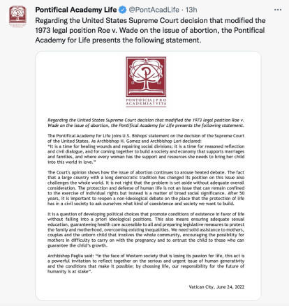 En una nota de prensa publicada en su Twitter, la Pontificia Academia para la Vida señaló: "el dictamen del Tribunal muestra cómo la cuestión del aborto sigue suscitando un acalorado debate. El hecho de que un gran país con una larga tradición democrática haya cambiado su posición sobre esta cuestión también interpela al mundo entero".