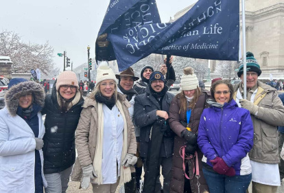 Manifestantes de la Asociación Médica Católica, con las batas sobre los abrigos, en la March for Life 2024 de Washington.