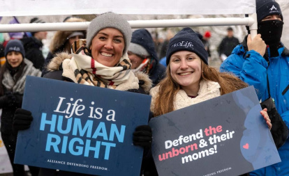 "La vida es un derecho humano"; "defender al no nacido y sus mamás", carteles de la Alliance Defending Freedom.