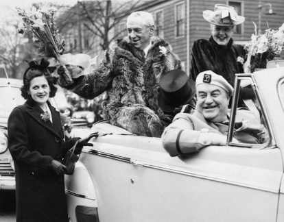El alcalde Curley vestido con su abrigo de mapache durante un desfile.