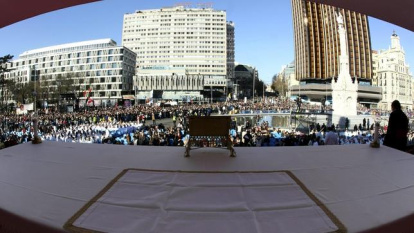Miles de personas se dieron cita en la Plaza de Colón y sus alrededores para participar en la Misa de la Sagrada Familia en la que el Papa Benedicto XVI, en conexión desde el Vaticano, alentó a las familias a ser "auténticos santuarios de fidelidad, respeto y comprensión" y a vivir con renovado entusiasmo la vocación cristiana en el seno del hogar, "como genuinos servidores del amor que acoge, acompaña y defiende la vida".