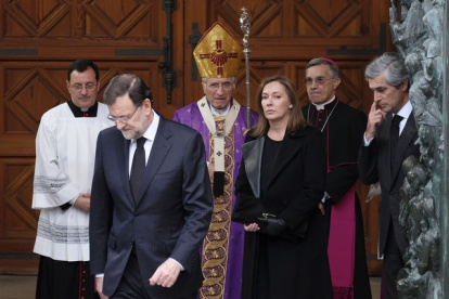 El presidente Rajoy y su esposa, Adolfo Suárez hijo, el cardenal Rouco y el obispo César Franco en la entrada de la Almudena