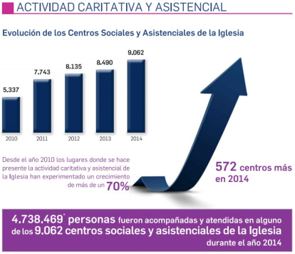 Es especialmente significativa la actividad caritativa y asistencial de la Iglesia en nuestro país, donde durante el año 2014, 4.738.469 personas fueron acompañadas y atendidas en alguno de los más de 9.000 centros sociales y asistenciales de la Iglesia.