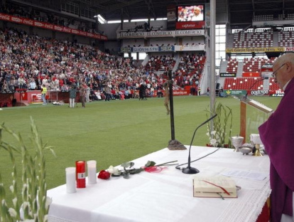 El padre Fueyo, celebrando misa en el estadio de El Molinón de Gijón