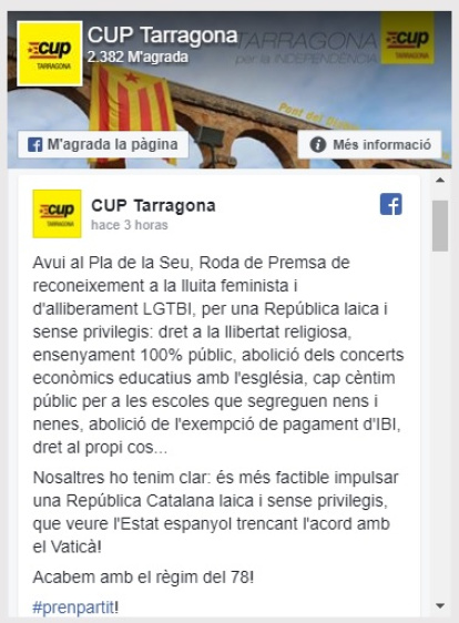 En su cuenta de Facebook la CUP de Tarragona explica su objetivo: "por una República laica y sin privilegios, derecho a la libertad religiosa, enseñanza 100% pública, abolición de los conciertos económicos educativos con la Iglesia, ni un céntimo público para las escuelas que segregan niños y niñas, abolición de la exención de pago de IBI, derecho al propio cuerpo..."