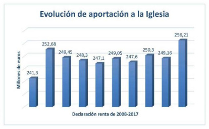 En la declaración de 2017 la cantidad destinada por los contribuyentes a la Iglesia católica aumenta en 7 millones de euros y alcanza los 256,21 millones de euros, un incremento del 2,83% con respecto al año anterior. Es la cifra más alta desde el comienzo del actual sistema de asignación tributaria en 2007, que promedia una subida anual del 0,58%.