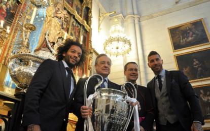 Los jugadores y el equipo del Real Madrid acudieron este domingo a la catedral de Santa María de la Almudena (www.catedraldelaalmudena.es), la patrona de Madrid, para presentar a la Virgen su título de la Liga de Campeones, el más prestigioso del fútbol europeo, que el club ha conseguido ya 13 veces. El club madrileño se ha coronado por tercer año consecutivo al vencer al Liverpool en Kiev (Ucrania).