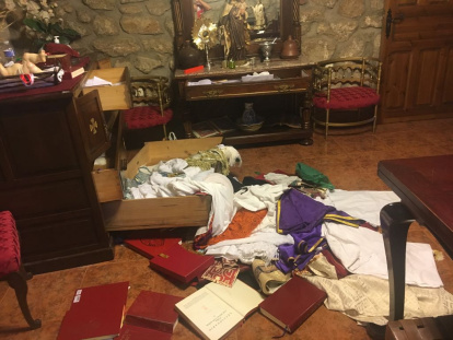 Unos desconocidos forzaron la puerta principal del templo, arrancaron el sagrario de la pared y lo tiraron al suelo, donde quedaron dispersas todas las Formas. Volcaron también el copón, los cálices y los vasos sagrados de la Misa. En la sacristía y en las salas de catequesis revolvieron todos los cajones, volcaron los hábitos y deterioraron todo lo que se encontraron por el camino.