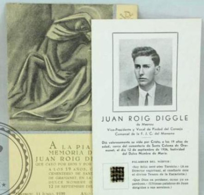 Joan Roig murió de 6 disparos el 11 de septiembre de 1936, tenía 19 años, era miembro de la Federación de Jóvenes Cristianos de Cataluña