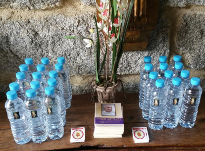Botellitas de agua bendita con la imagen de la Divina Misericordia; catequesis de cuaresma del Papa Francisco, detentes del Sagrado Corazón... todo a la entrada para que los fieles se lo puedan llevar