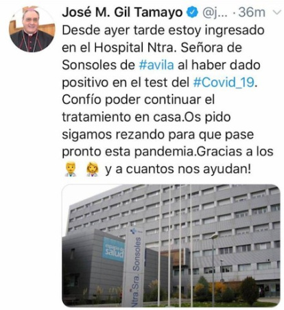 El obispo de Ávila, José María Gil Tamayo, que fue portavoz y secretario de la Conferencia Episcopal Española entre 2013 y 2018, fue ingresado este viernes en el Hospital Nuestra Señora de Sonsoles de la capital abulense, al haber dado positivo en el test de coronavirus.