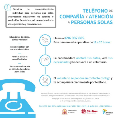 En paralelo a la iniciativa Coordinadora de Centros de Escucha en Estado de Alarma, el Arzobispado de Madrid ha abierto también un teléfono de compañía y atención a personas solas con el apoyo de Cáritas Diocesana de Madrid y la Delegación Episcopal de Jóvenes.