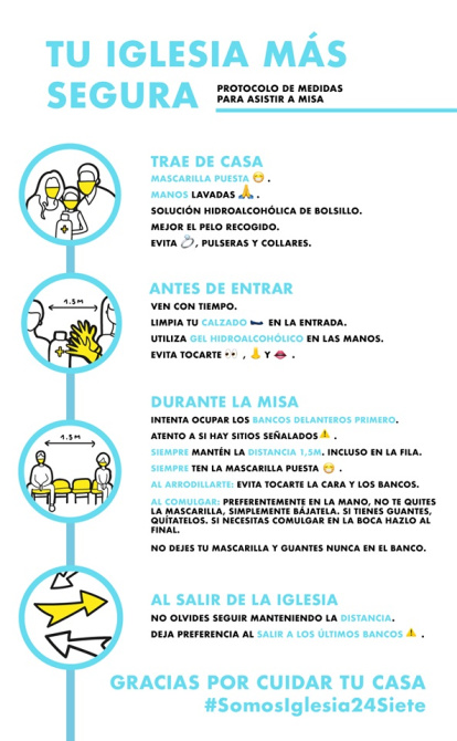 En estas parroquias se han asegurado de no superar un 30% del aforo, se han desinfectado los templos y voluntarios de pastoral han ido explicando las indicaciones precisas a los fieles que asisten. Además, todas las diócesis españolas mantienen suspendida la obligación de ir a misa el domingo (aunque los fieles siguen obligados a santificar el domingo de alguna manera, orando en casa o siguiendo las misas por TV, radio o Internet).