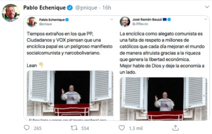 Echenique responde (con 2.600 likes y 1.400 reenvíos en 23 horas): "tiempos extraños en los que PP, Ciudadanos y Vox piensan que una encíclica papal es un peligroso manifiesto socialcomunista y narcobolivariano".