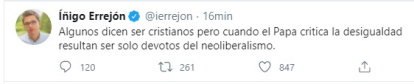 Íñigo Errejón, de la izquierda populista de Más Madrid, comenta en su cuenta: "algunos dicen ser cristianos pero cuando el Papa critica la desigualdad resultan ser solo devotos del neoliberalismo".