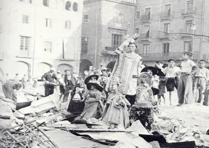 Escenas en la hermosa Plaza del Mercado de Vic en julio de 1936, con milicianos (en su mayoría de Barcelona) amontonando objetos religiosos y de piedad popular para hacer una gran hoguera