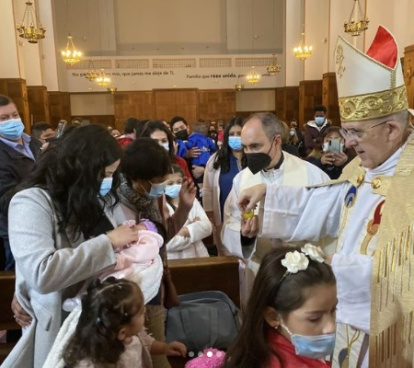 El cardenal entregó un centenar de Biblias y Rosarios a las familias de todos los niños bautizados y las que se quieren bautizar en la parroquia.