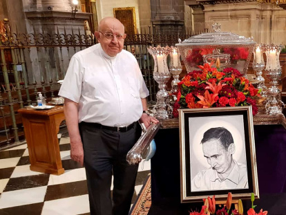 El sacerdote Rafael Higueras, postulador de la causa del beato Lolo, con sus reliquias; aunque suelen estar en Santa María, en Linares; aquí estaban en la catedral de Jaén por el centenario de Lolo