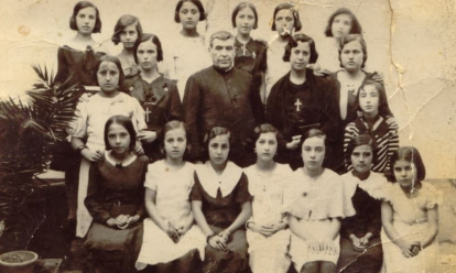 El beato mártir Francisco Solís, párroco de Mancha Real, con las alumnas del colegio SADEL, la red católica que nació en 1934 cuando la República prohibió las escuelas de religiosos.