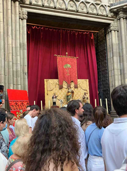 Una de las paradas de la procesión en la basílica barcelonesa de Santa María del Pí, en una calle abarrotada por los asistentes.