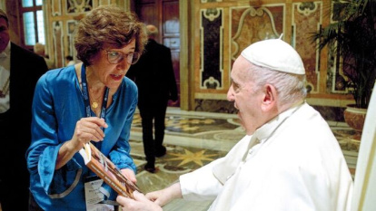 Celia Hierro, la postuladora de la causa, enseña al Papa Francisco su biografía de la Madre Luisa Sosa.