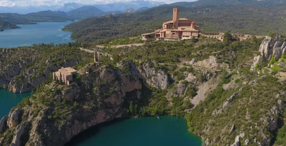 Torreciudad: a la izquierda de la foto, la antigua ermita; a la derecha, el gran santuario moderno propiedad del Opus Dei.