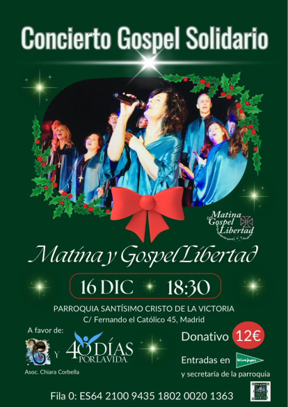 La parroquia Santísimo Cristo de la Victoria, en la calle Fernando el Católico 45 de Madrid, acogerá el concierto gospel solidario de Matina y Gospel Libertad en beneficio de 40 días por la vida y la Asociación Chiara Corbella. La cita será el próximo sábado 16 de diciembre a las 18:30 horas.