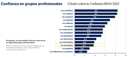 Pero en España, los sondeos de valores ya antes (como el de BBVA de 2022) detectaban que, estadísticamente, los españoles confían muy poco en los sacerdotes, y sólo los políticos les merecen menos confianza. Curiosamente, pese a la conciencia general de que los niños en España reciben una educación de bajo nivel y con muchos problemas, los maestros reciben una nota altísima. Quizá muchos, de edad elevada, puntúan a unos y otros por experiencias que vivieron hace 40 años, y desde entonces ya no tienen apenas trato con estos colectivos.