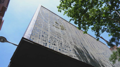 La parroquia del Espíritu Santo de Barcelona, barrio del Guinardó, con su vitral visto desde fuera.