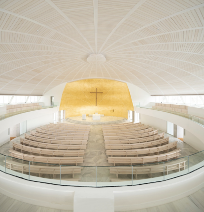Con una capacidad para 500 personas, la estructura alberga no solo un espacio de culto sino también un centro de formación en la fe. Su forma elíptica, caracterizada por dos grandes cúpulas sostenidas por siete columnas, simboliza la unión entre la perfección del círculo y la direccionalidad espiritual, creando un espacio que invita a la reflexión y al encuentro espiritual.