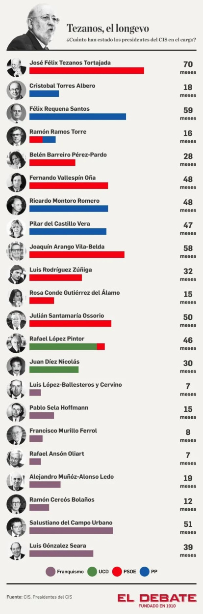 El militante socialista José Félix Tezanos cumplirá en junio 6 años al frente del CIS, el Centro de Investigaciones Sociológicas, la institución del estado español que hace sondeos y encuestas y estudios sociológicos. Como recuerda un artículo de El Debate, con una detallada infografía, jamás un director del CIS pasó tanto tiempo en el cargo, ya que habitualmente pasaban unos 4 años en esa función.
