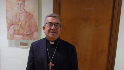 Luis Argüello junto a un retrato del obispo y beato Florentino Asensio, vallisoletano como Argüello; Asensio es mártir, fue asesinado en 1936 al poco de llegar como obispo a Barbastro.