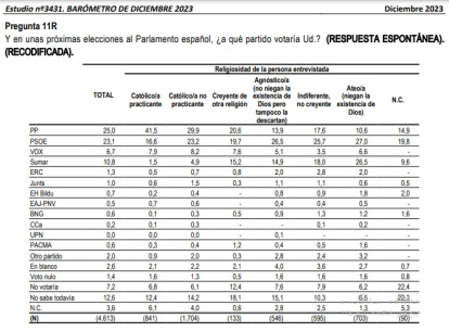 Según el CIS de diciembre de 2023 (sometido a todas las dudas del CIS desde que lo dirige el activista socialista José Félix Tezanos) 1 de cada 6 católicos practicantes en España querría votar al PSOE en las elecciones al Parlamento español (un 16,6%), y entre los católicos no practicantes, serían un 23% los votantes del PSOE.